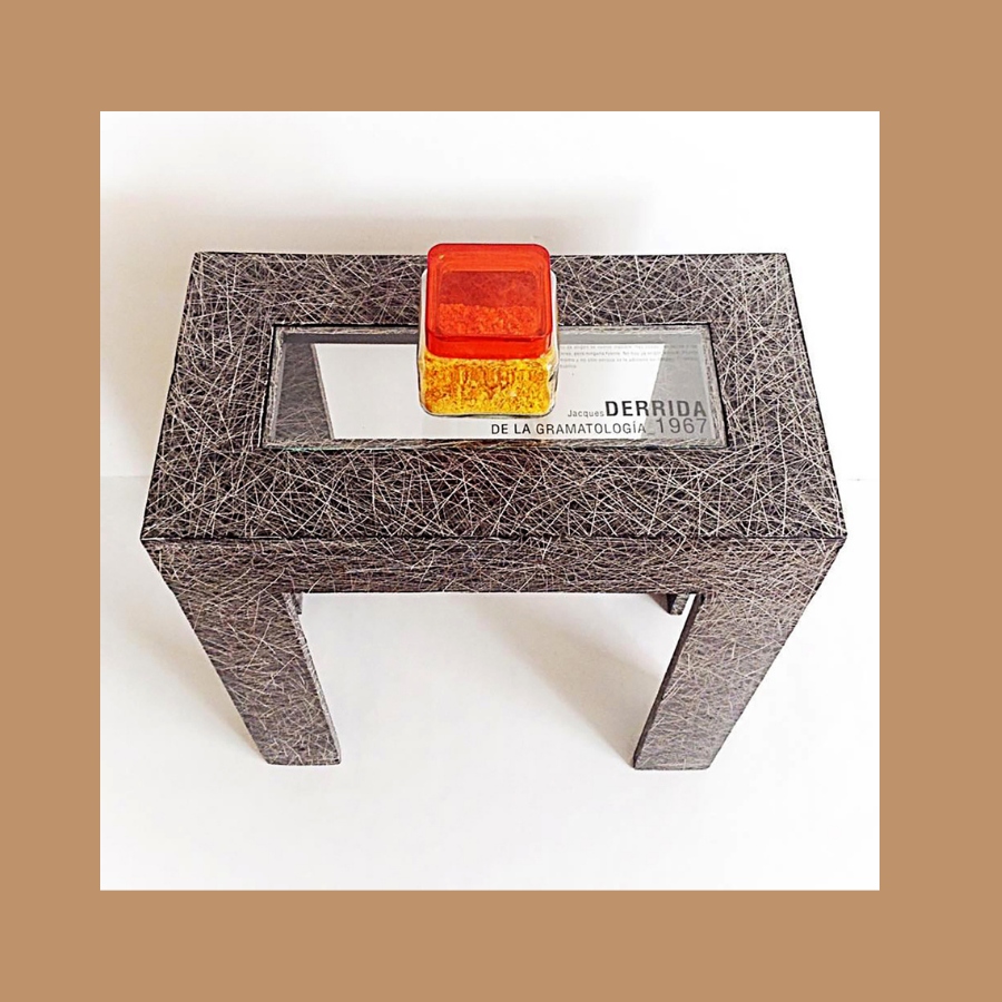 Diagrama Derrida. 2016. Óleo sobre madera, granos —residuos de pintura— ocluidos en contenedor de vidrio, tipografía y espejo. 27.92" x 21.45" x 11.81" (71 x 54.5 x 30 cm)